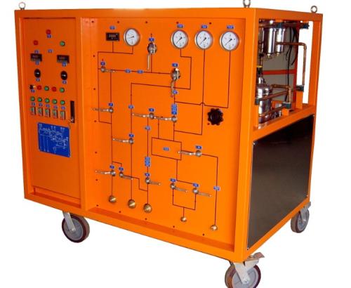 在充放时,首先利用本装置的真空泵对SF6电器设备(或钢瓶)和连接管路进行抽真空,然后直接利用压差或利用压缩机的抽吸性并造成一定的压差将装置贮存容器内的SF6充入SF6电器设备,直至达到所需的工作压力。在需灌瓶时则同时利用如前所述的R22制冷剂的特性,将液化的SF6直接灌入钢瓶。