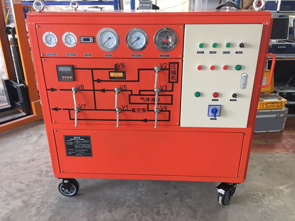 当SF6从一个气室中抽出时,气体便自动地流经净化过滤器,通过SF6压缩机压缩冷却,可以气态也可以在一定高压下以液态形式储入SF6贮罐。