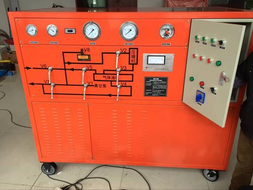 具有回收、充放、净化、抽真空、贮存、灌瓶等综合性功能,系统比较完全。各功能的串联或切换主要通过操作集中于面板一侧的电控箱和球阀来完成。