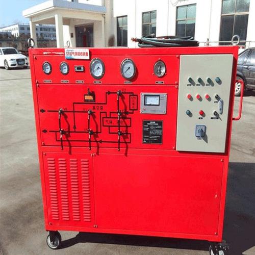 在充放时,首先利用本装置的真空泵对SF6电器设备(或钢瓶)和连接管路进行抽真空,然后直接利用压差或利用压缩机的抽吸性并造成一定的压差将装置贮存容器内的SF6充入SF6电器设备,直至达到所需的工作压力。在需灌瓶时则同时利用如前所述的R22制冷剂的特性,将液化的SF6直接灌入钢瓶。